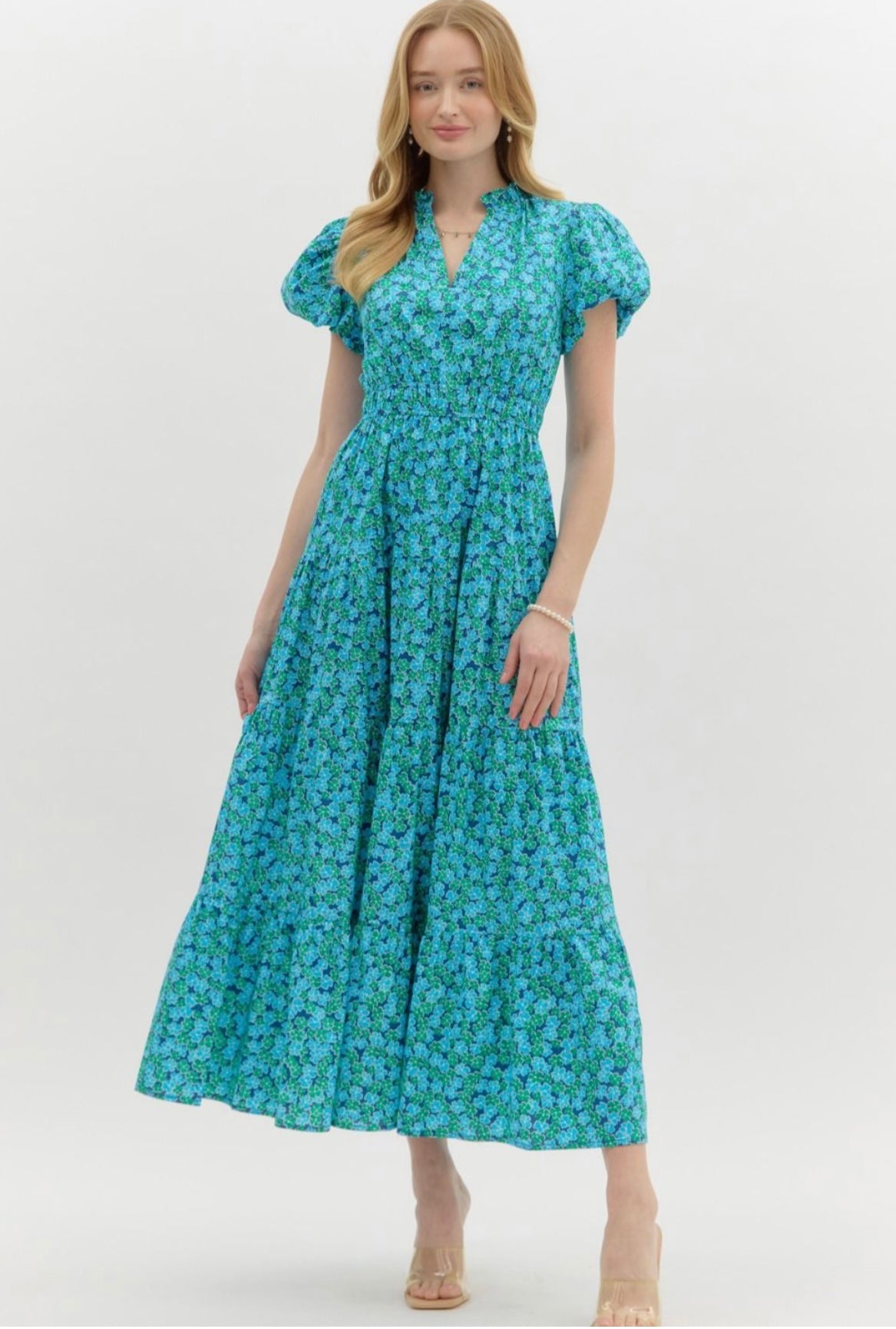 Floral print ruffle accented split V-neck pullover tiered midi dress with bubble short sleeves featuring elastic waistband.