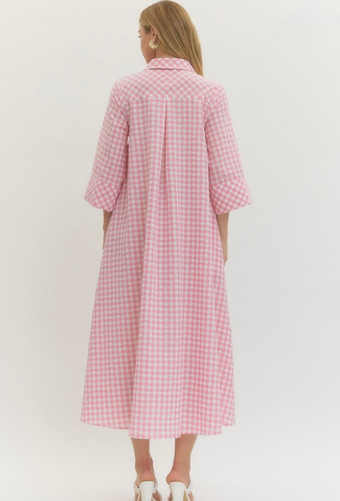Pink Gingham 3/4 sleeve Midi dress featuring hidden button closure at front. Shirt collar. Side pockets. Unlined. Woven.