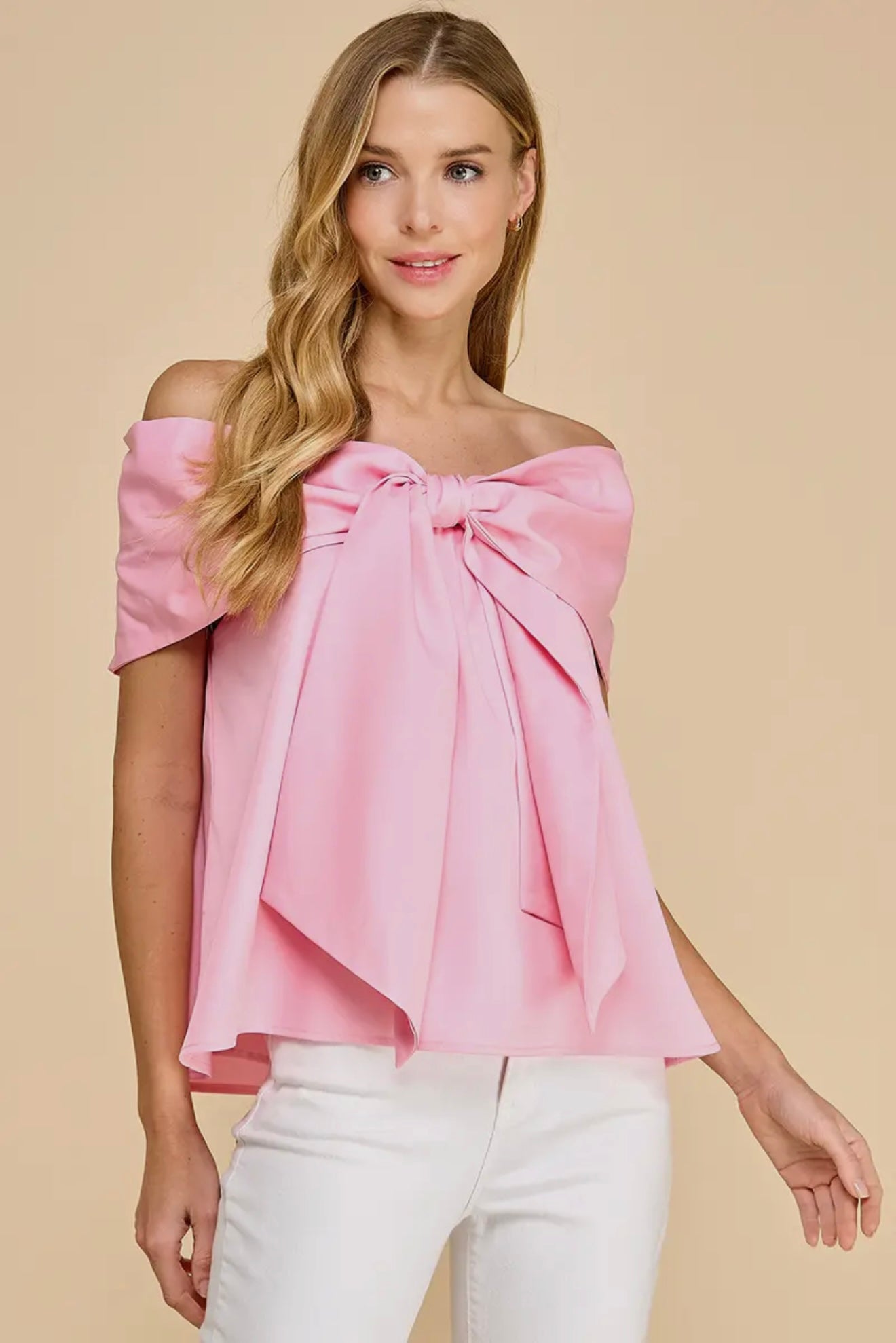A woven off the shoulder top with accented bow, lined. The prettiest top that screams ELEGANT.