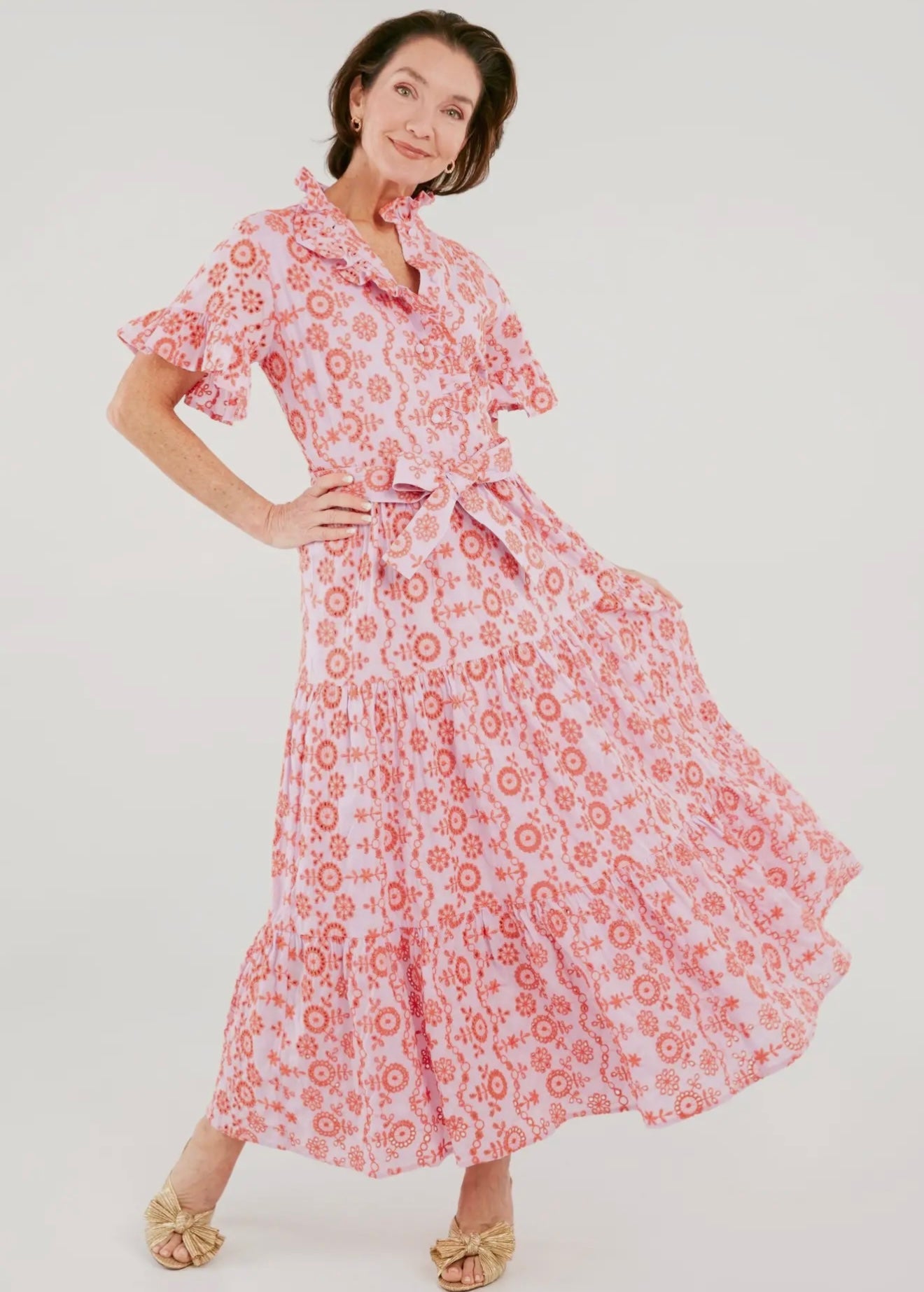 Summer isn't complete without an eyelet dress! Look no further than our darling Sadie Maxi Dress featuring a ruffle collar, tiered skirt, and fabric belt. This lavender coral-accented eyelet is fresh and feminine, an instant classic that you'll reach to for years to come.