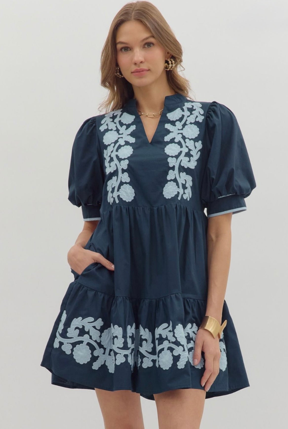 Solid short puff sleeve tiered mini dress featuring embroidery detailing. Side pockets. Lined. Woven. Non-sheer.