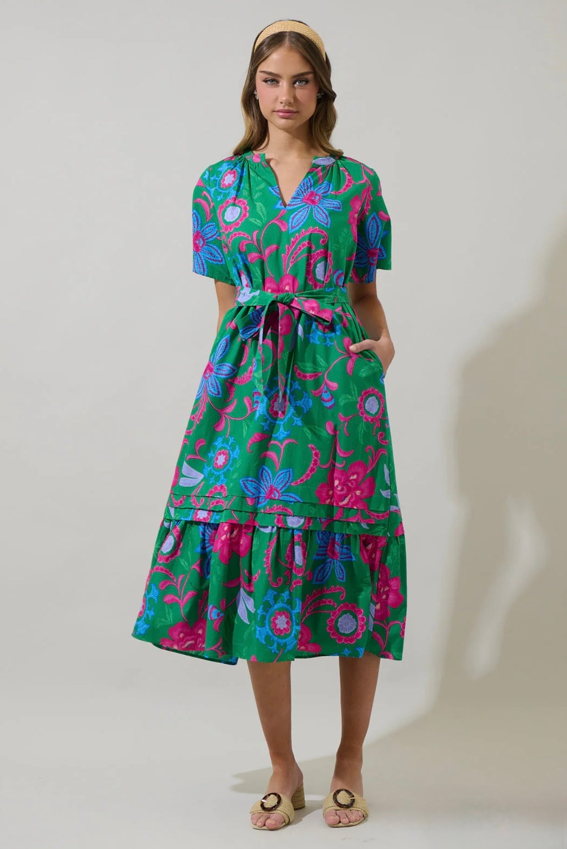 Feel the warmth of a floral paradise every time you slip into this dress. Short sleeves frame a split neckline. It is a long length and has pleated detail in the bottom to elevate your everyday style with ease. Wear it with matching heels to go along.