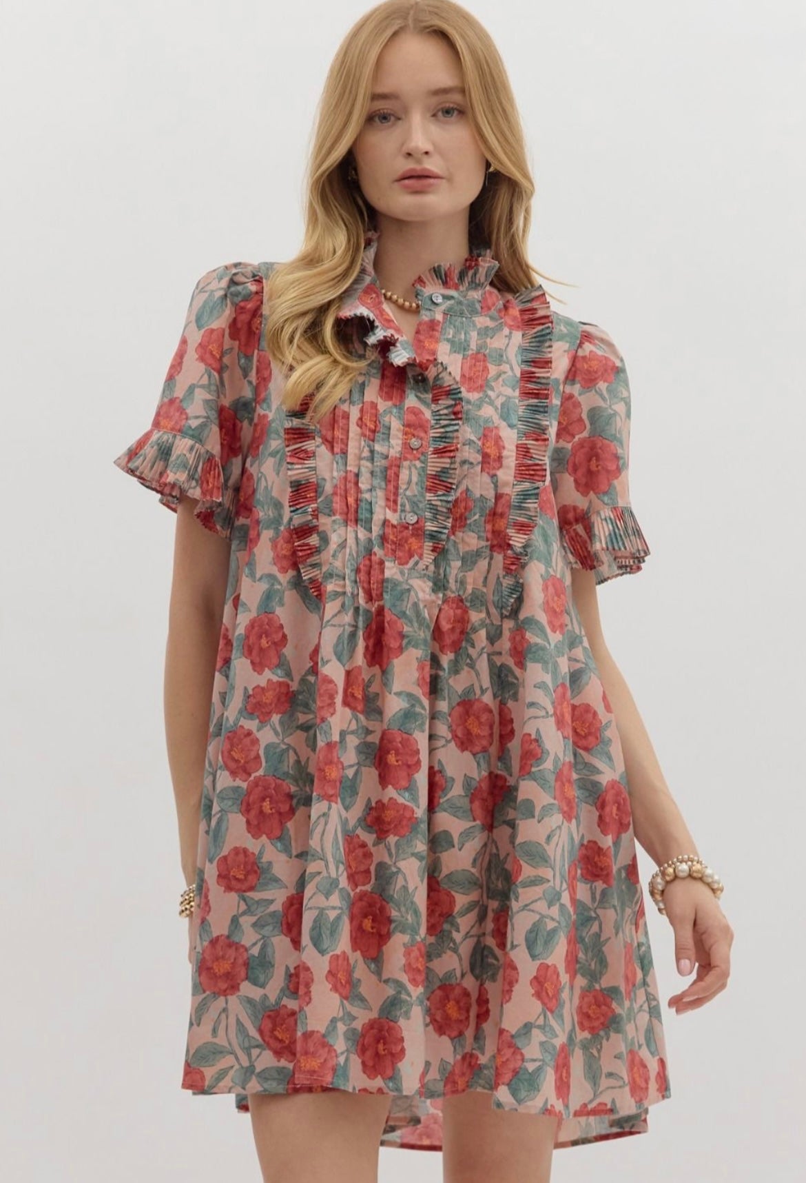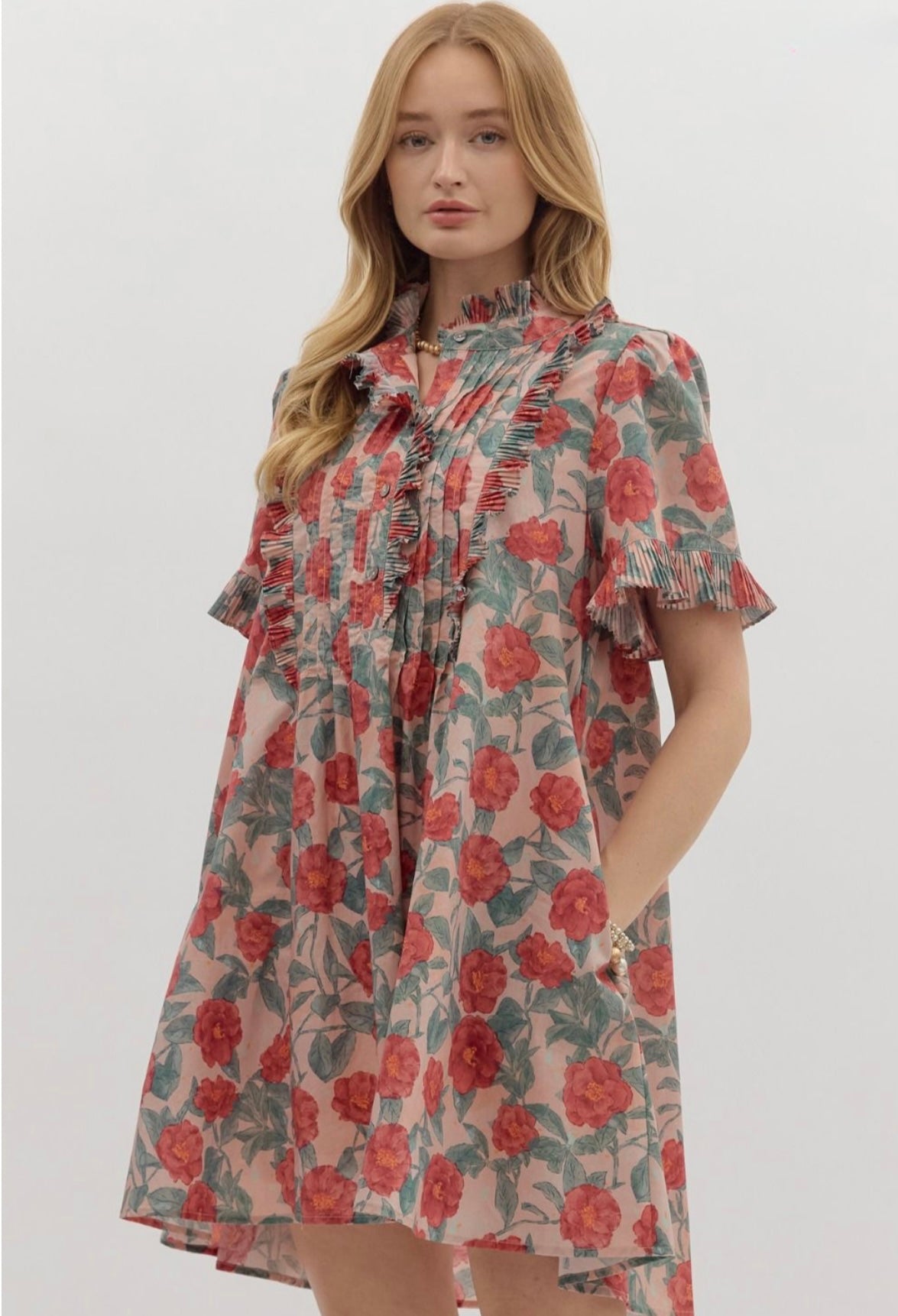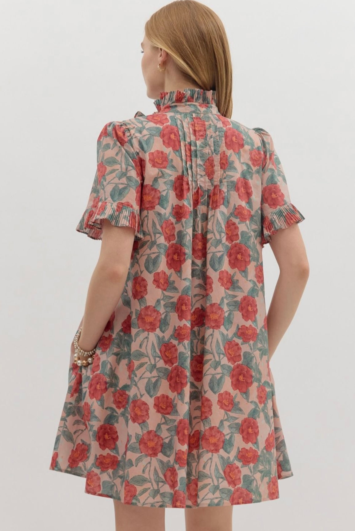 Floral print short sleeve pintuck mini dress featuring pleat-accent ruffle details. Pockets at sides. Lined. Woven. Non-sheer. Lightweight.
