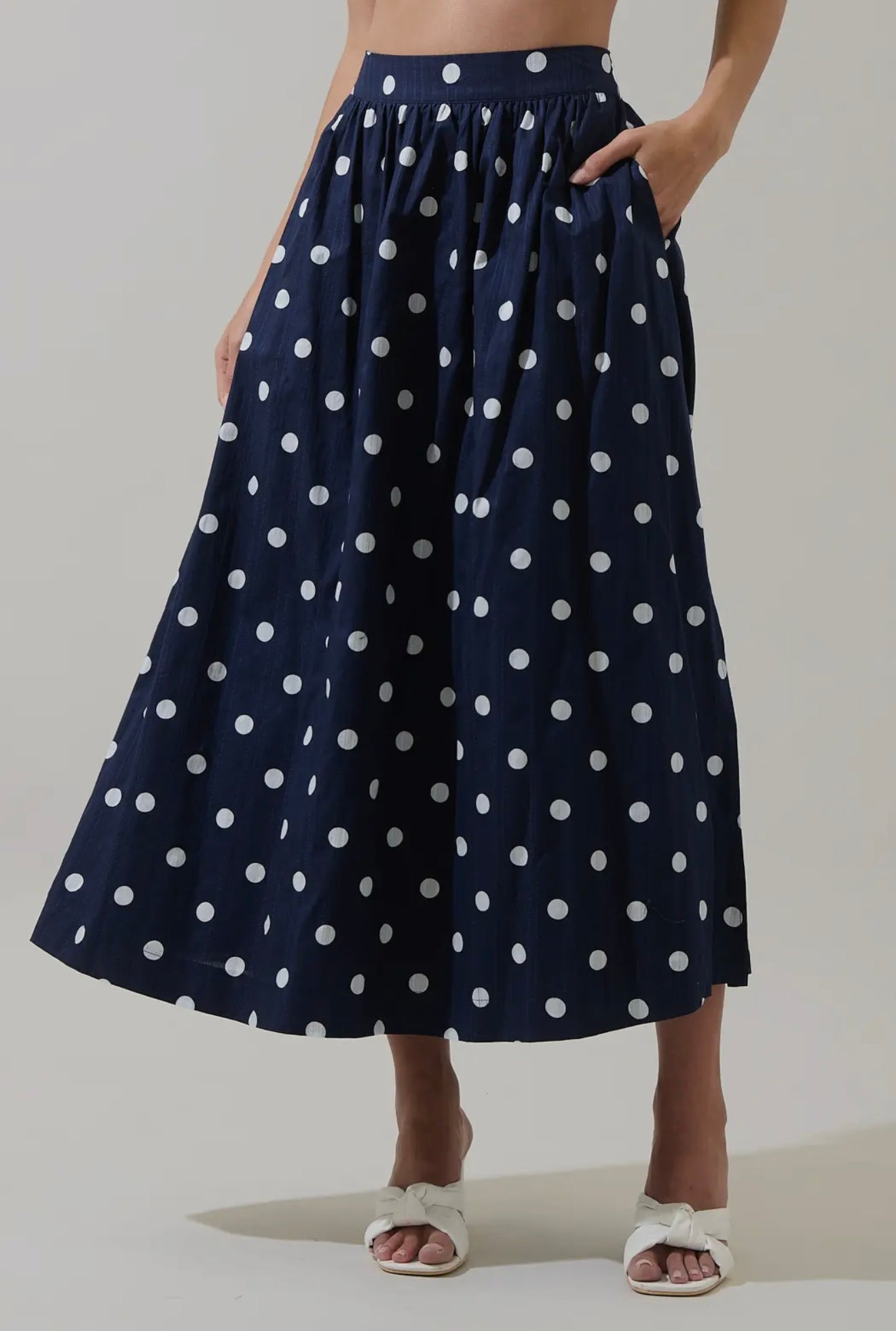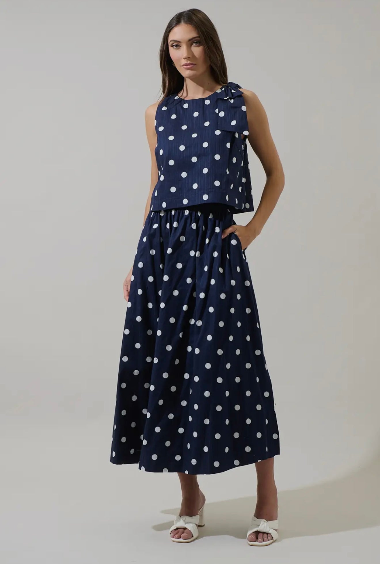 Bring playful polish to your wardrobe with the Caryn Polka Dot Maxi Skirt, featuring a flirty side slit, handy pockets, and an invisible back zipper for a sleek finish. Pair with the matching top for a complete look! Complete the outfit with block heels and a straw clutch for effortless charm.