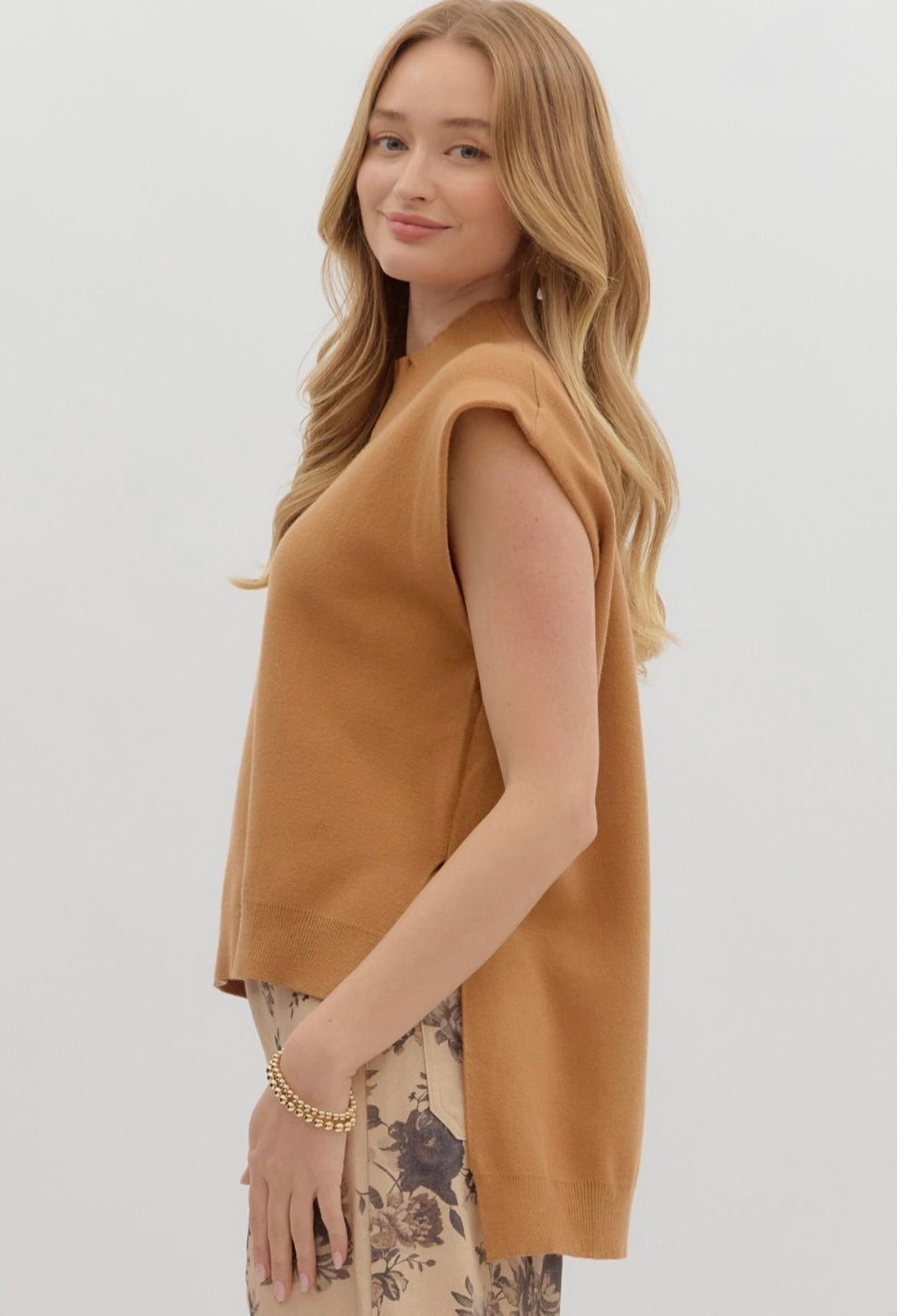 Solid mock neck muscle tee sweater knit hi-lo pullover.