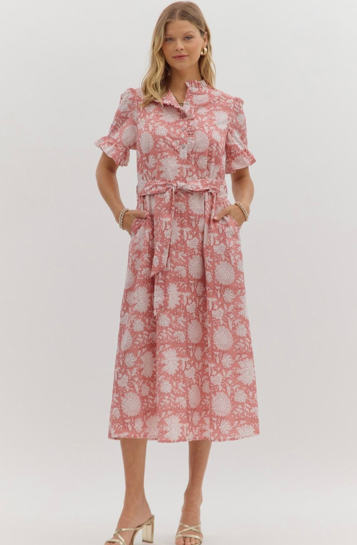Floral print ruffle hem short sleeve midi dress featuring ruffle neckline and button front closure. Removable self belt. Side pockets. Lined. Woven. Non-sheer. Lightweight.
