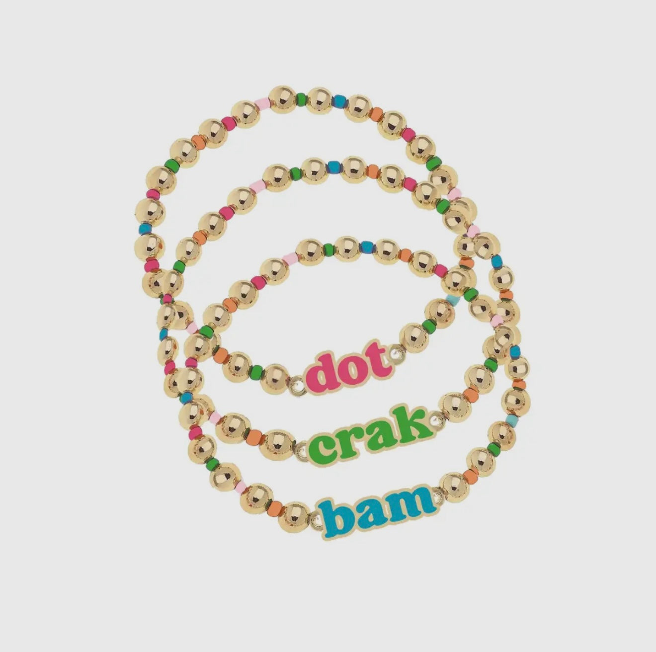 The Dot Crack Bam Rainbow Ball Bead Stretch Bracelet Set of 3 features three vibrant bracelets with multi-colored ball beads. This playful set adds a burst of color to your wrist and is perfect for stacking and mixing with other jewelry.
