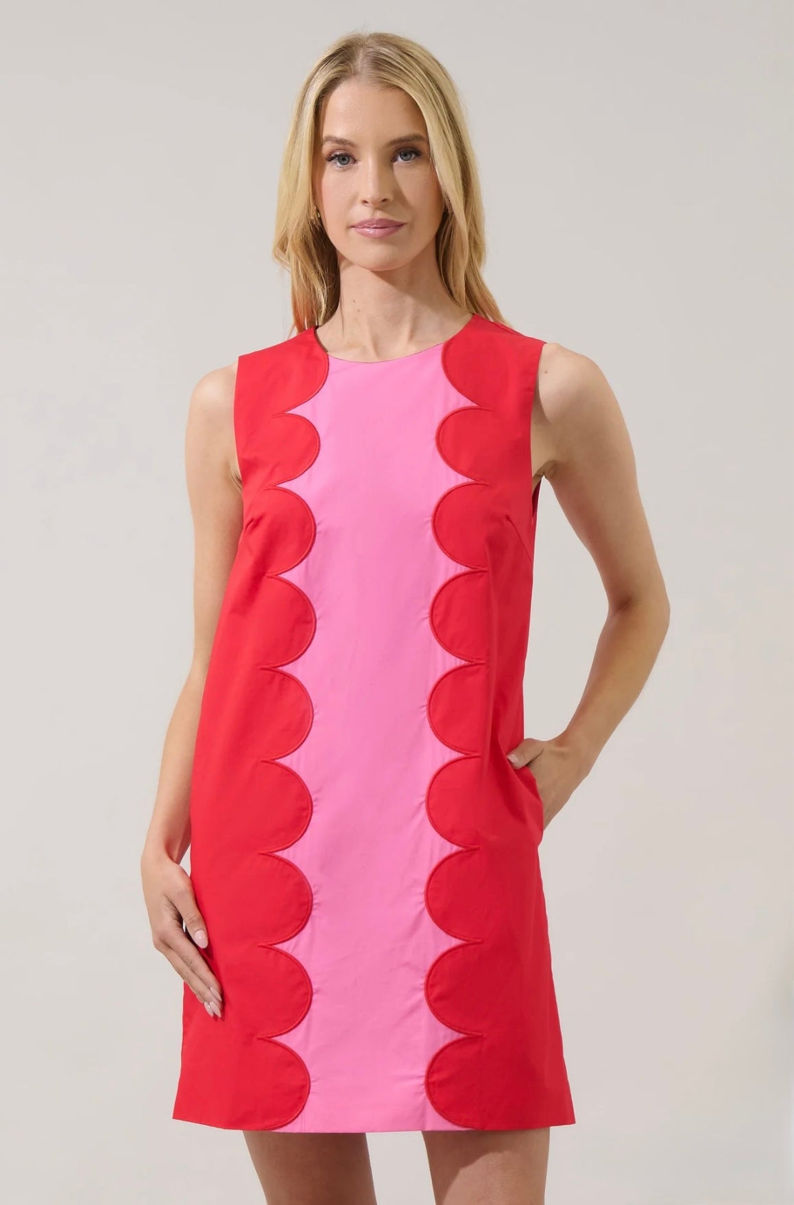 Step out in style and turn heads in this dress. Featuring a playful color block scallop pattern, a sleek sleeveless design, and a hidden back zipper, it's the perfect mix of fun and sophistication.
