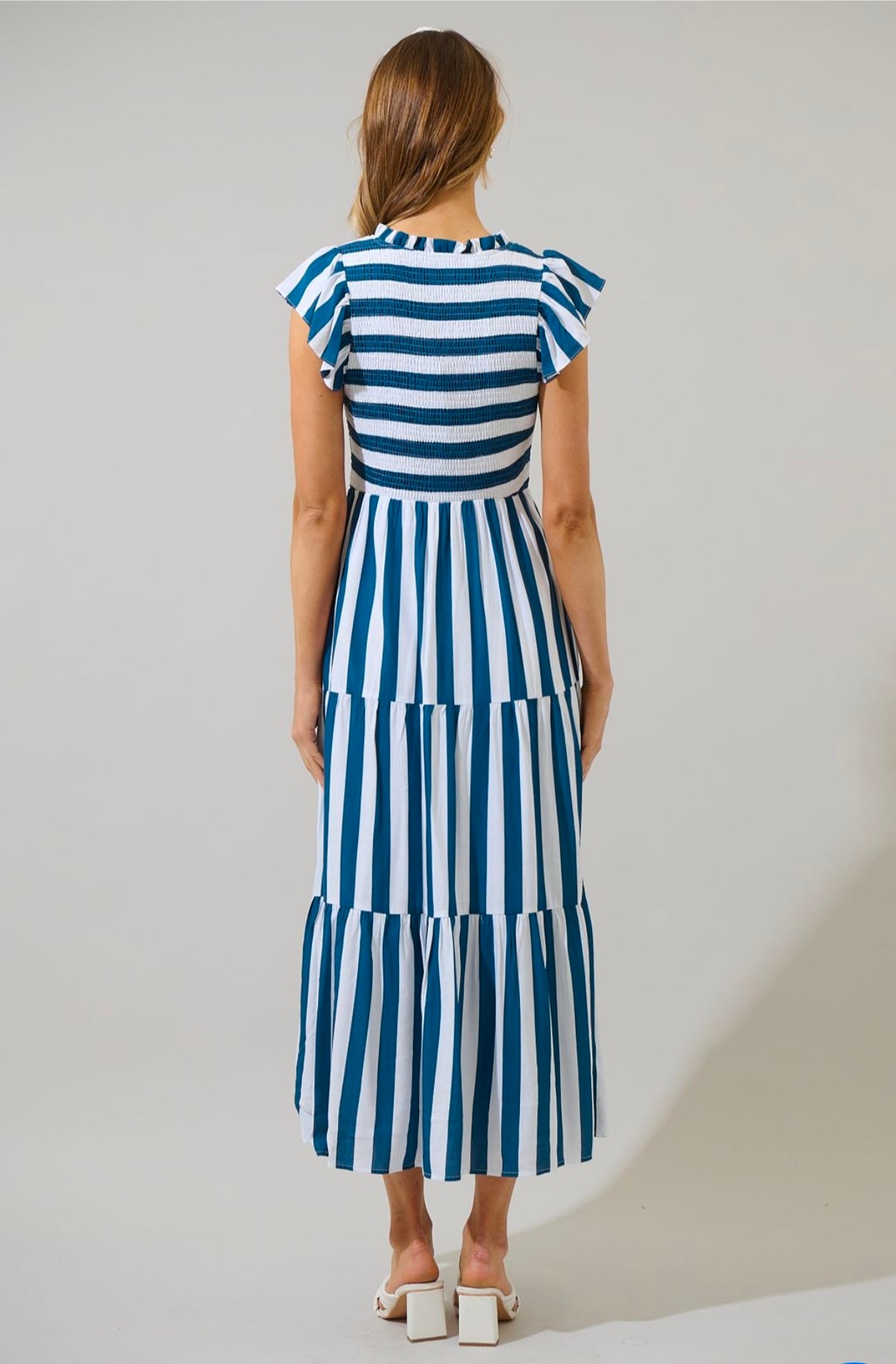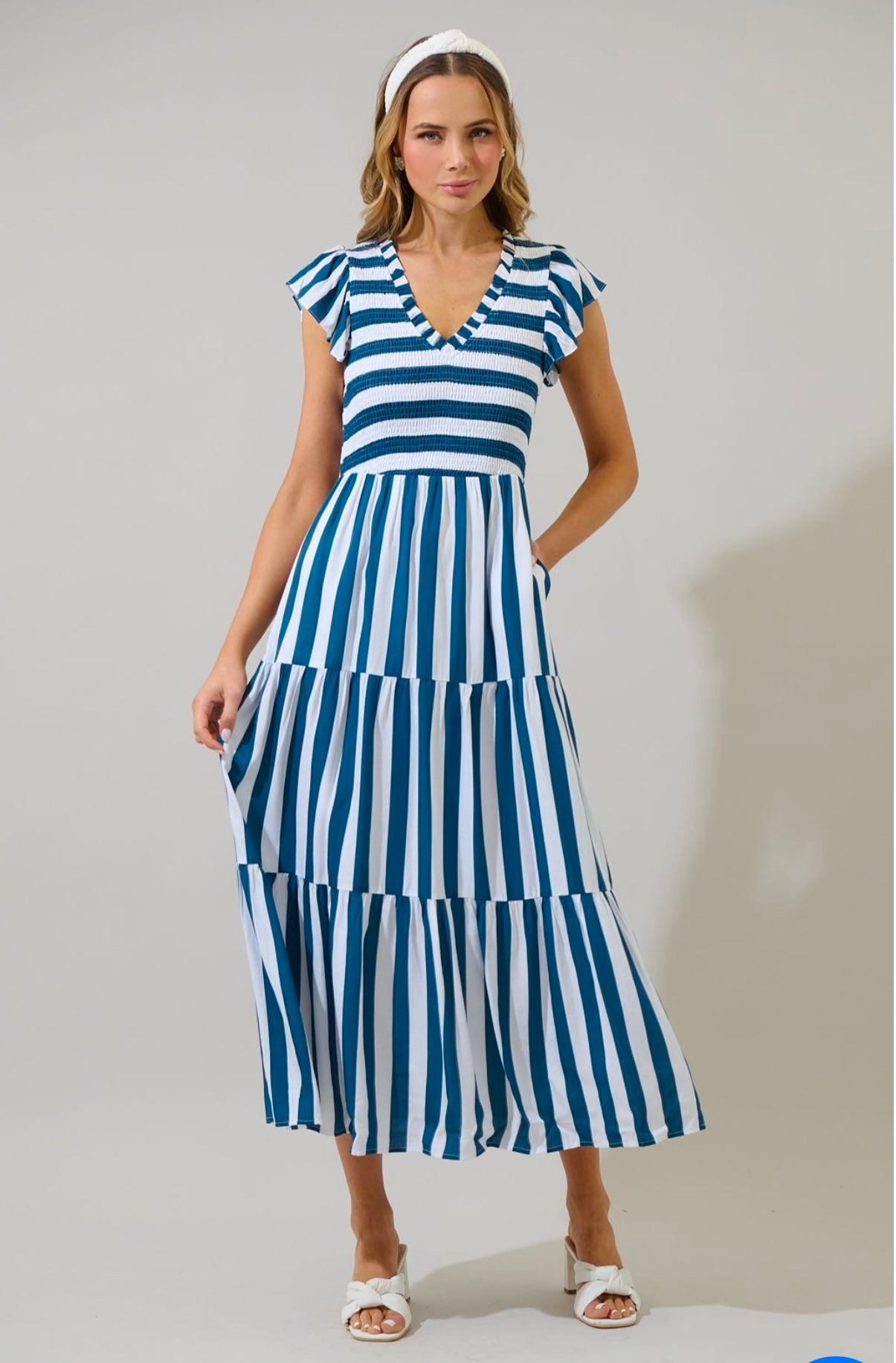 The Emerly Striped Sunfire Tiered Midi Dress creates a perfect blend of comfort and style that effortlessly flows from day to night. It features a flattering smocked bodice with a ruffle V neckline, framed by ruffle cap sleeves. It maintains a fit and flare silhouette with a tiered maxi skirt.