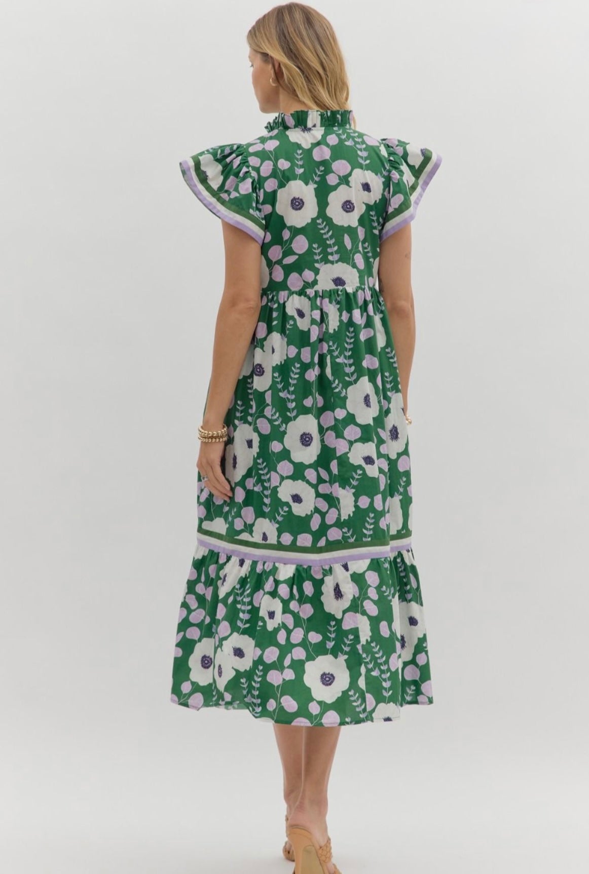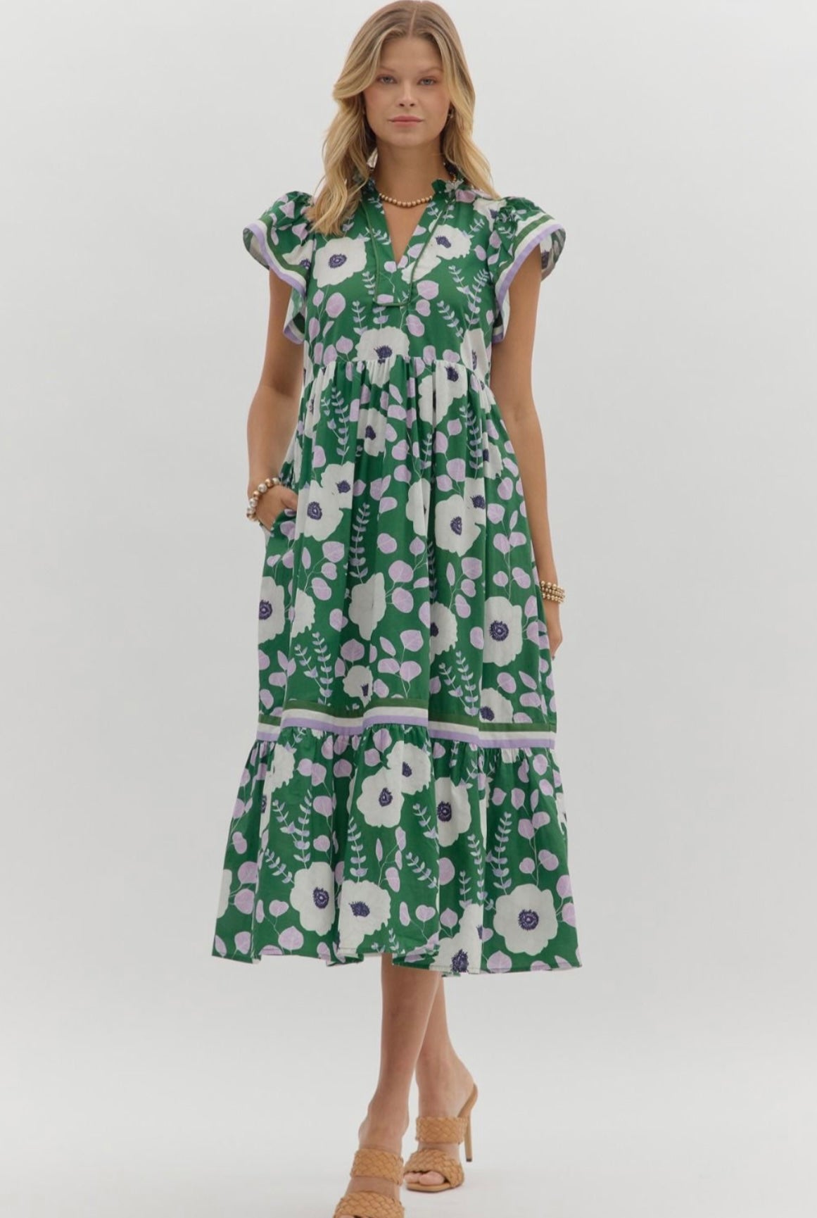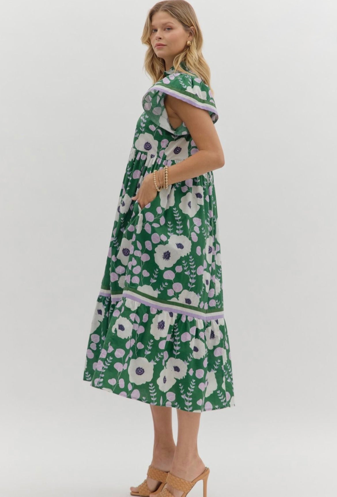 Floral print flutter ruffle sleeve tiered pullover midi dress featuring multicolor band detail. Side pockets. Lined. Woven.