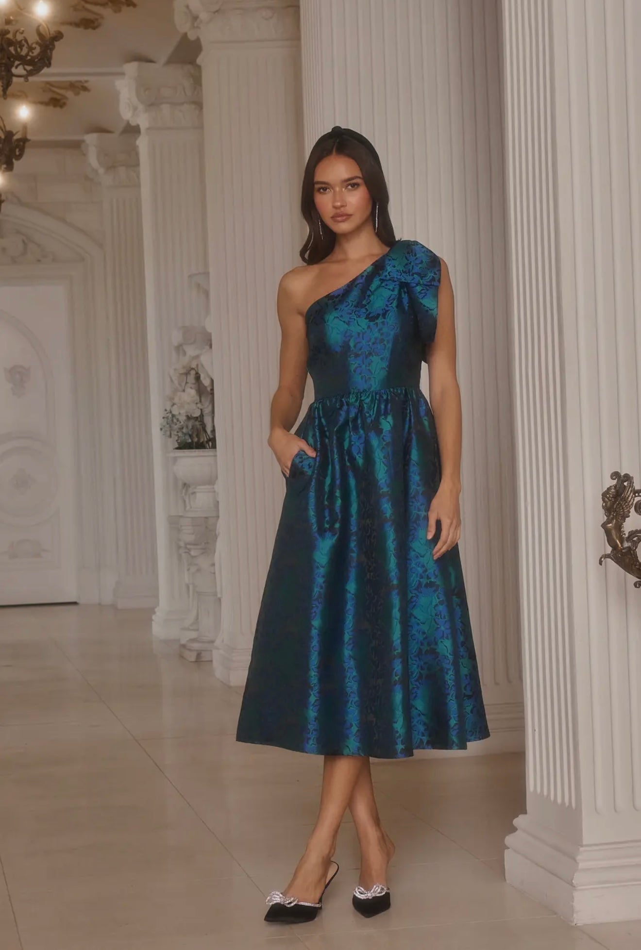 Let your dedication to style blossom in the Farrah Jacquard Floral Miley Bow Midi Dress. A jacquard floral print designs this one shoulder dress with a big bow at the shoulder. The bottom is flared with an invisible zipper on the side. Add on a black mules or strappy heels to go along.