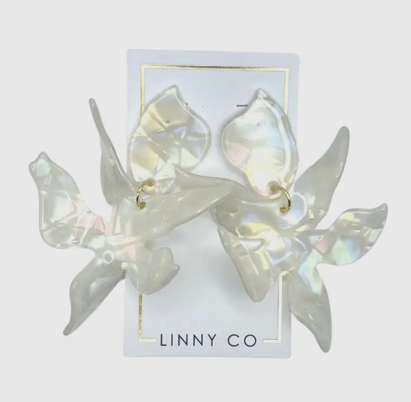 Our popular Linny Co flora earrings in the prettiest Irridescent white to compliment EVERY outfit!