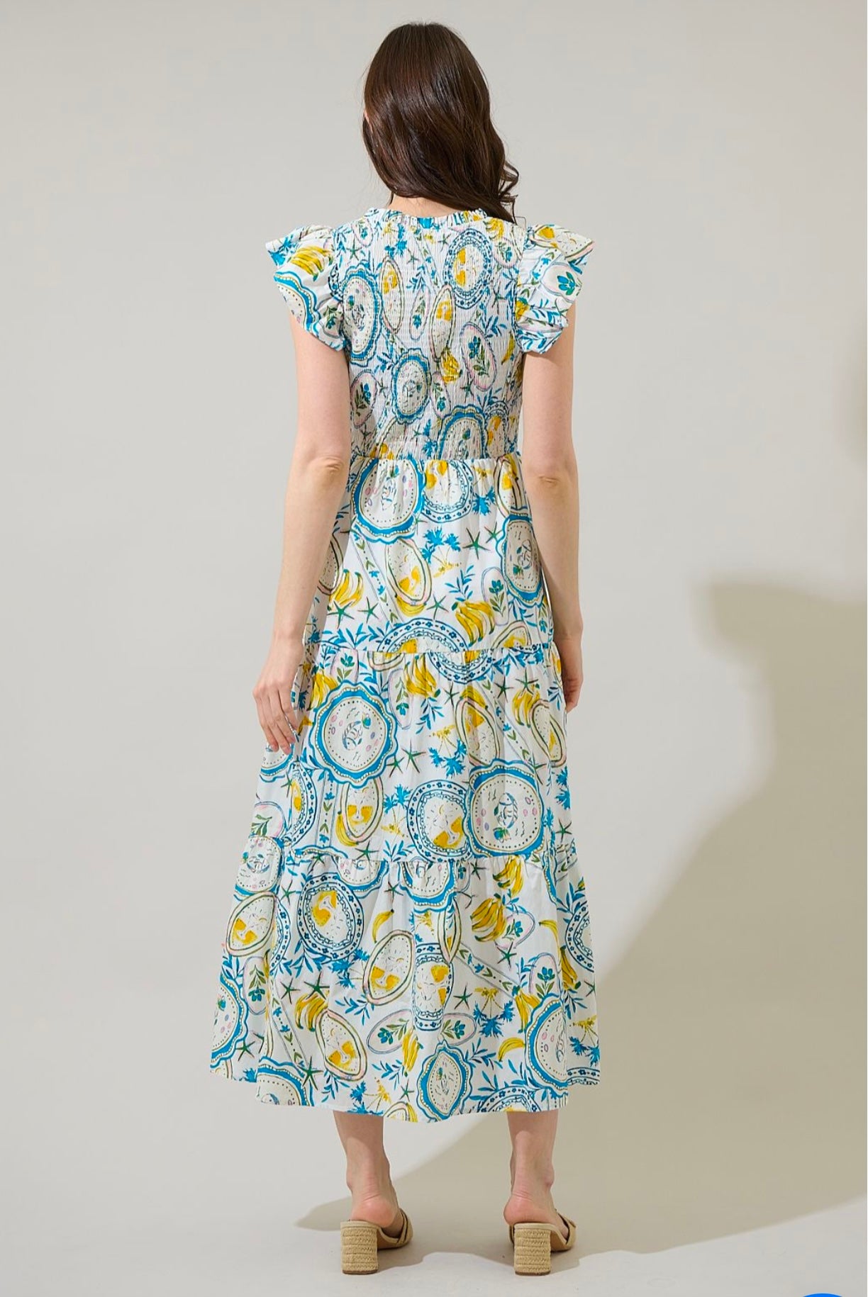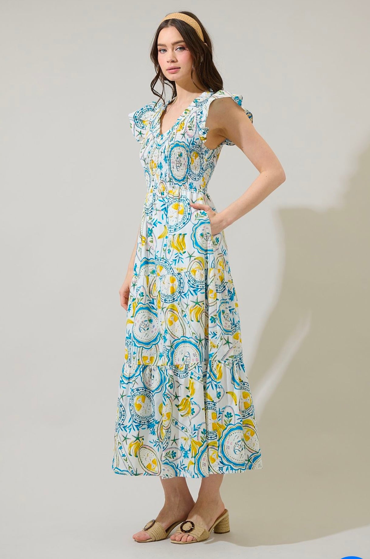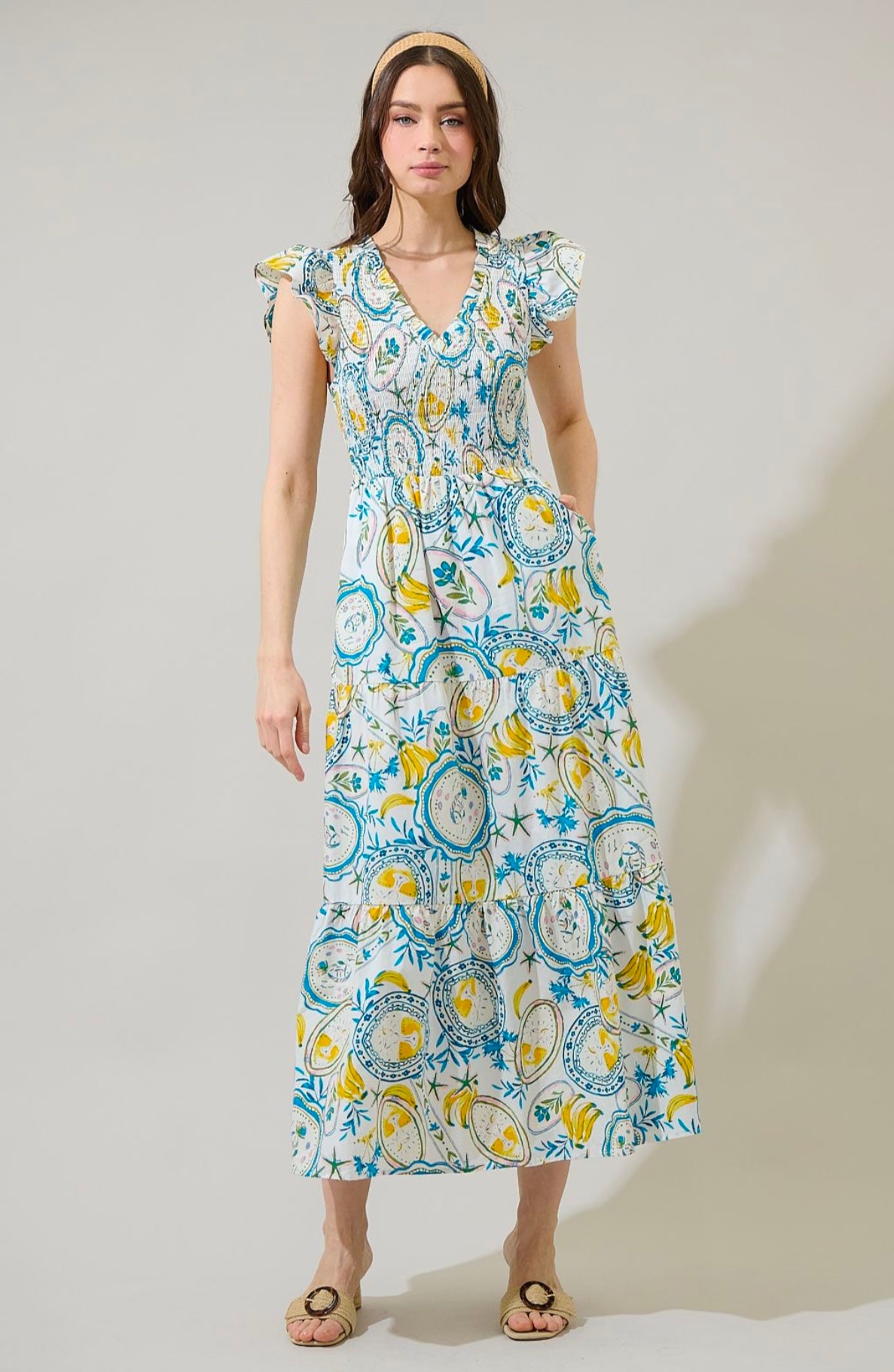 You'll have a perfect look for all your activities with the Harvest Island Sunfire Tiered Midi Dress. It features a flattering smocked bodice with a ruffle V neckline, framed by ruffle cap sleeves. It maintains a fit and flare silhouette with a tiered maxi skirt. Complete the look by pairing it with cute sandals or heels.