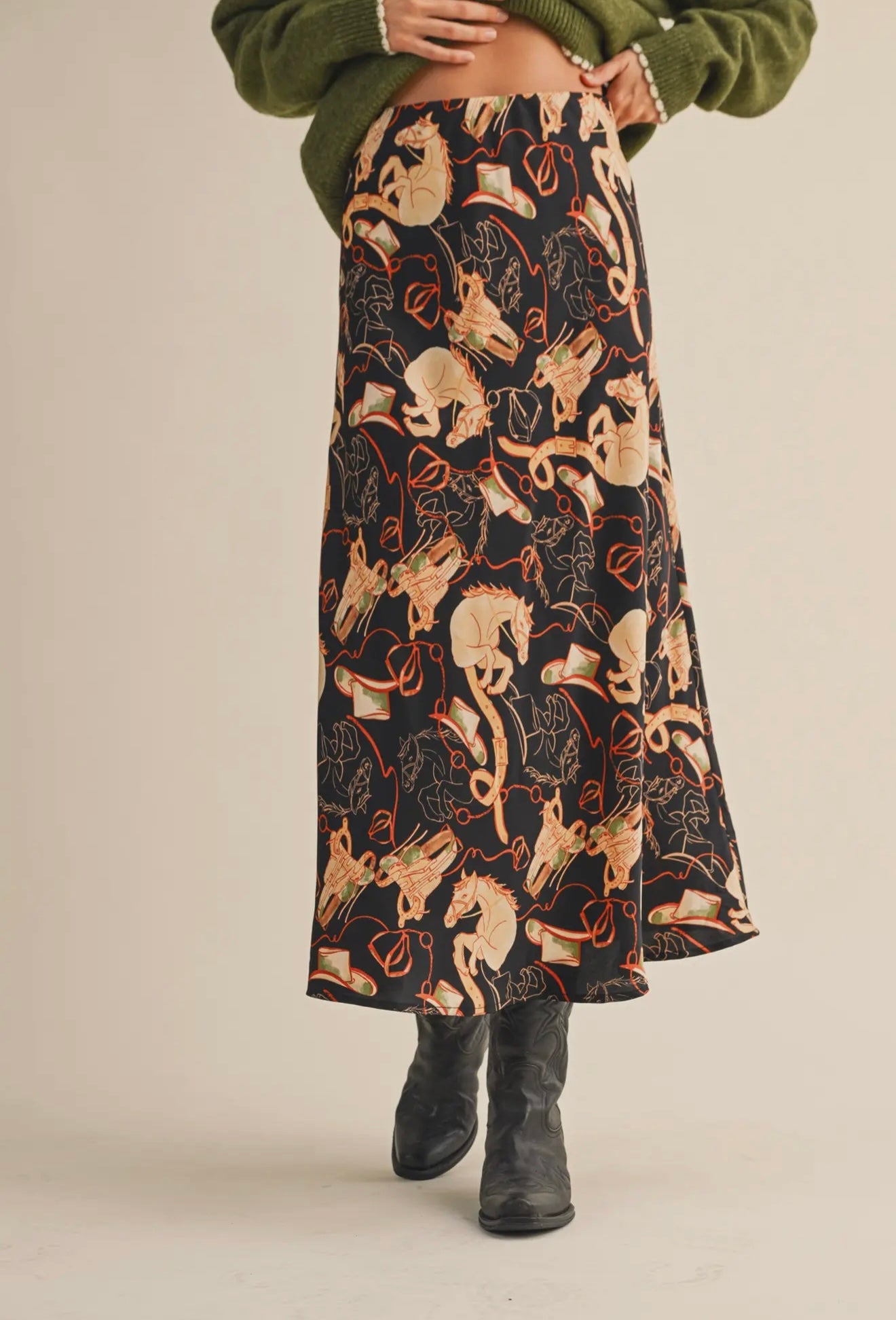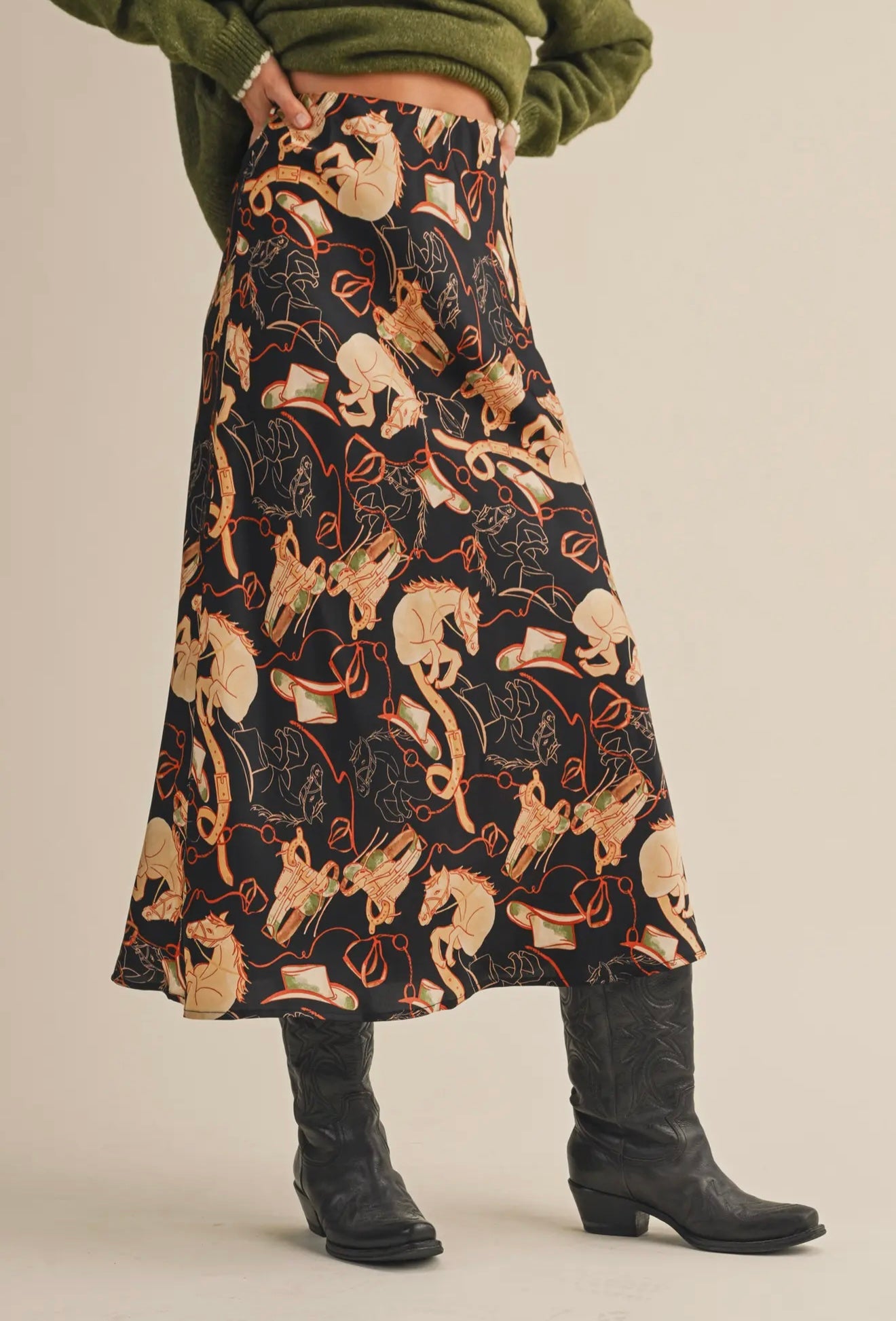 *Satin western print midi slip skirt