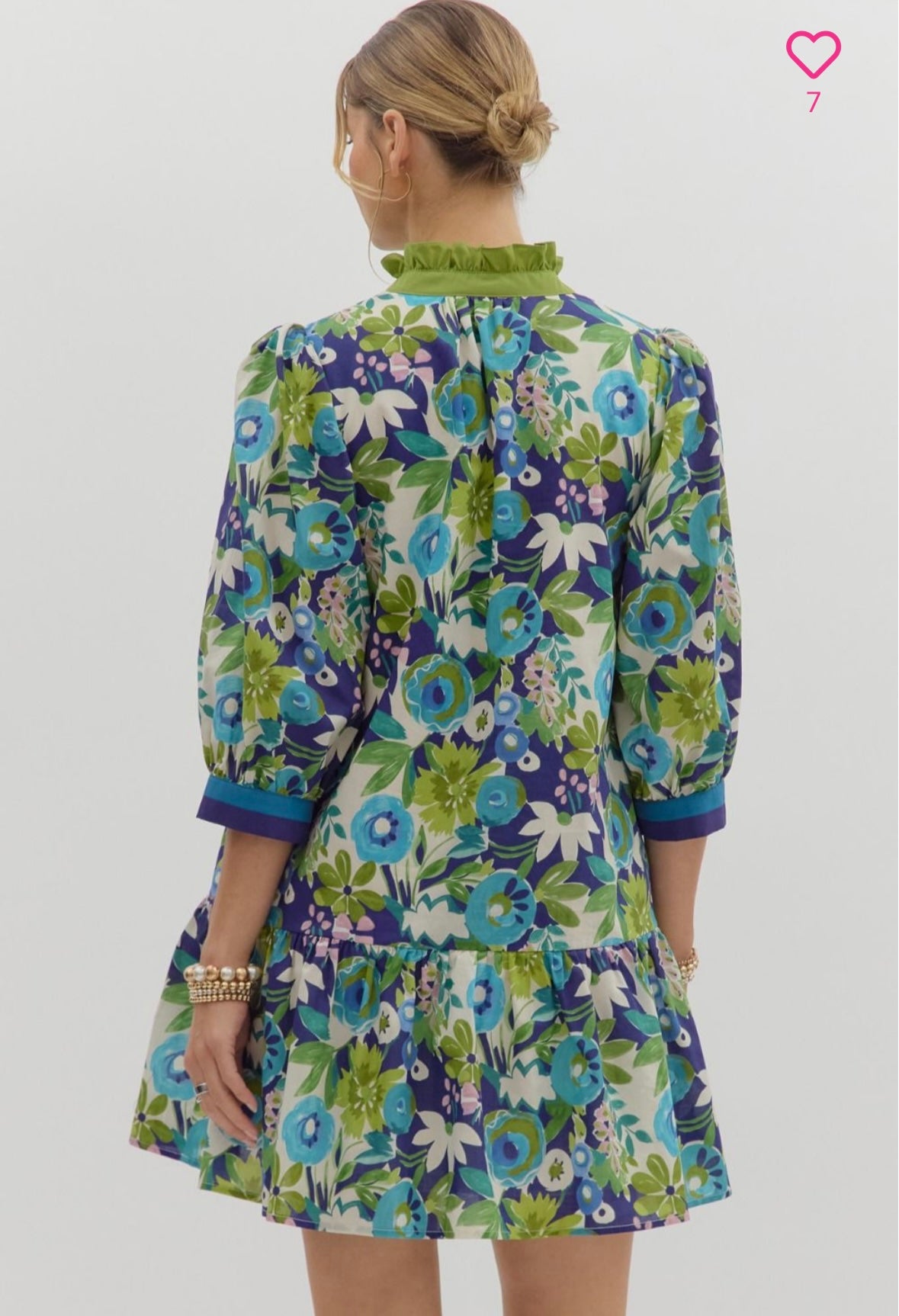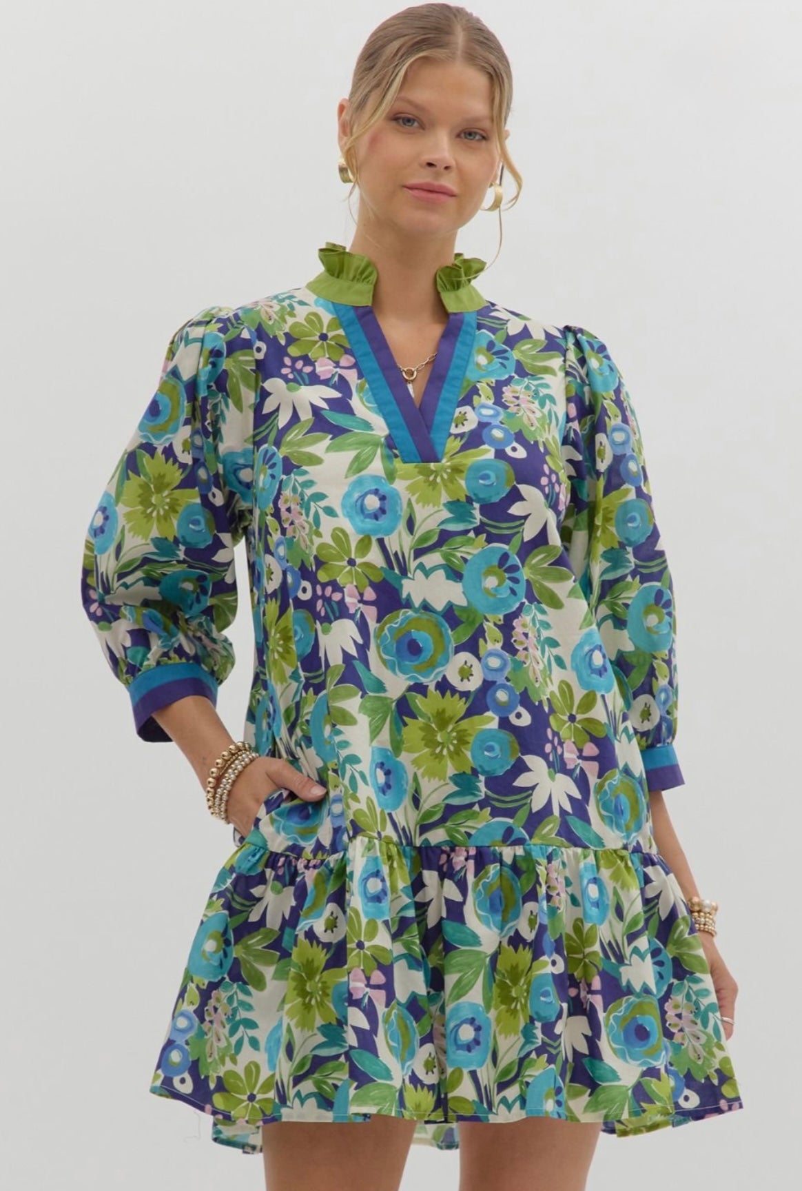Multi-floral pattern ¾ sleeve ruffle hem mini dress featuring multicolor band and ruffle accent V-neck detail. Side pockets.
