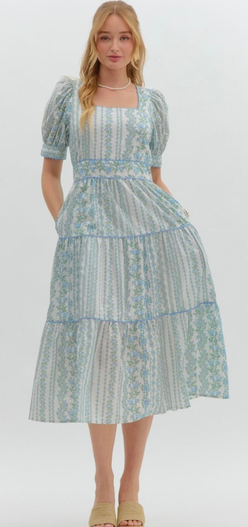 Floral print squareneck short puff sleeve pullover midi dress featuring seams accented with scallop trim. Elasticated smocked waistband at back. Pockets at side. Button closure at back. Lined. Woven. Non-sheer. Lightweight.