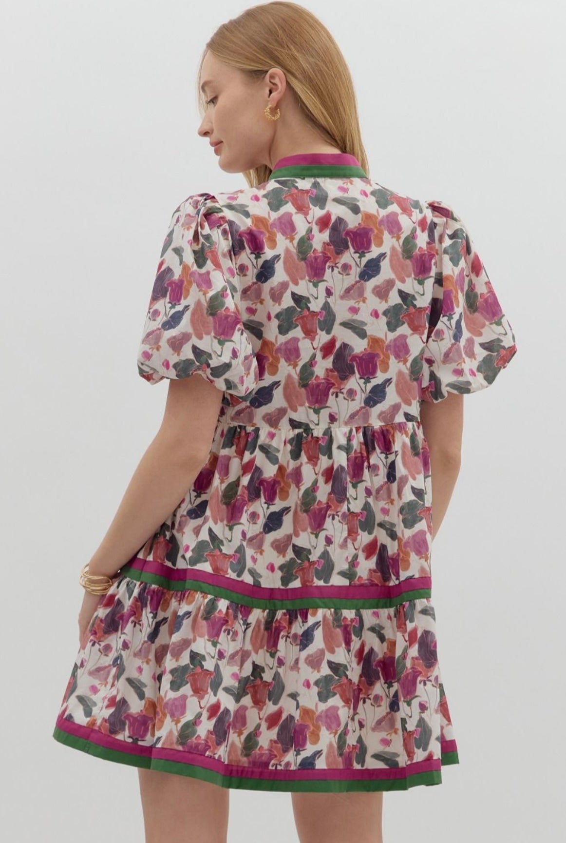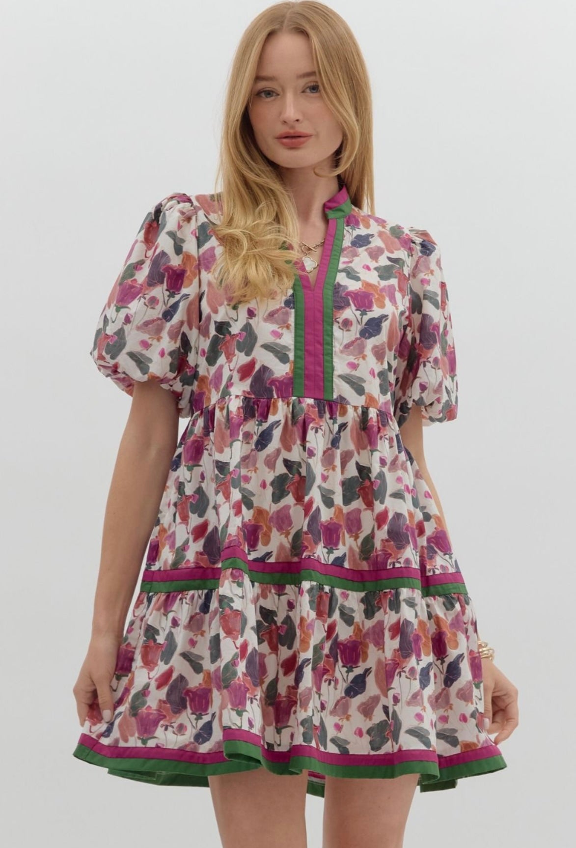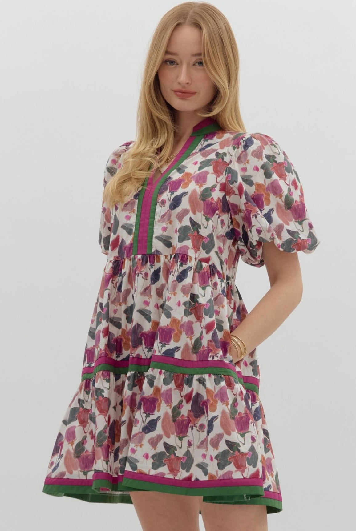 Multicolor floral print short bubble sleeve pullover tiered mini dress featuring mulicolor band accent. Pockets at sides.