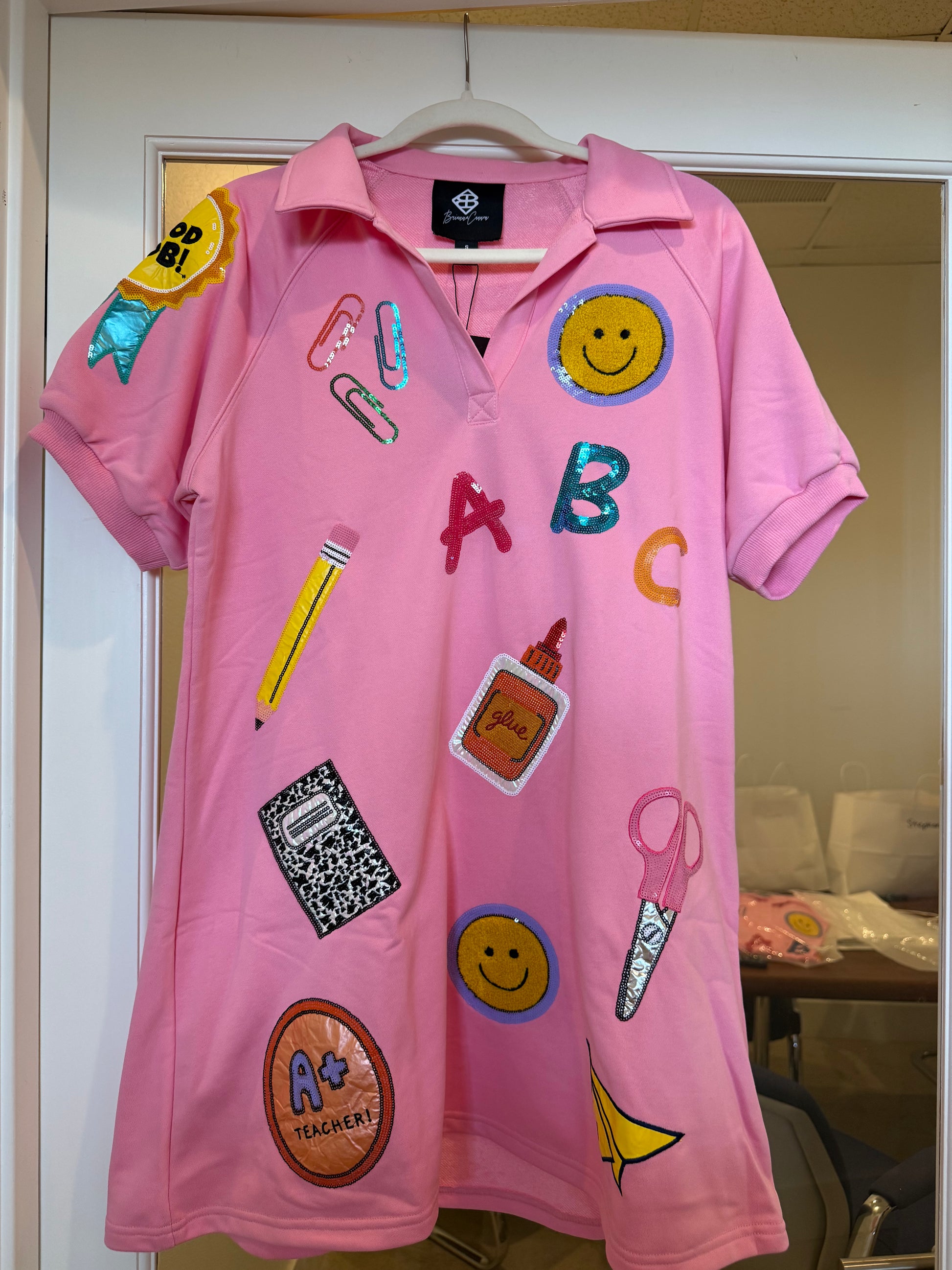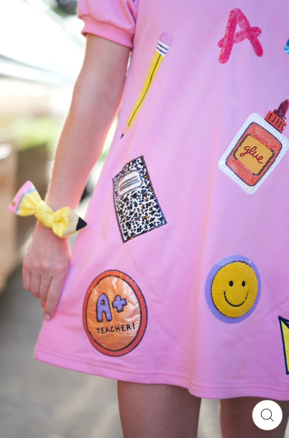 - Bursting with playful school-themed stickers like glue, pencils, smiley faces, and At stickers—-this dress is made for standout classroom style!