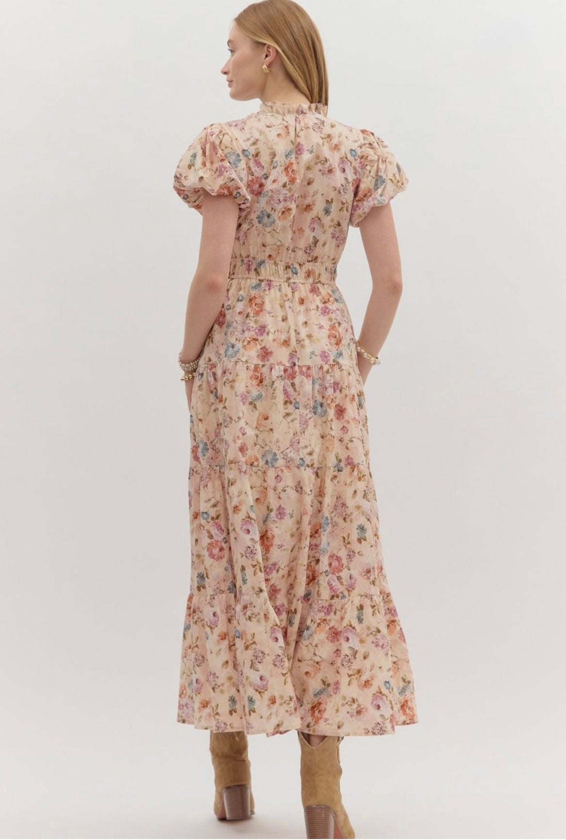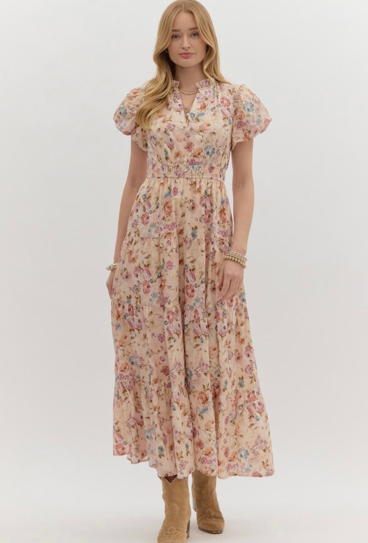 Floral print short bubble puff sleeve pullover midi tiered dress. Double elasticated waist. Lined. Woven. Non-sheer.
