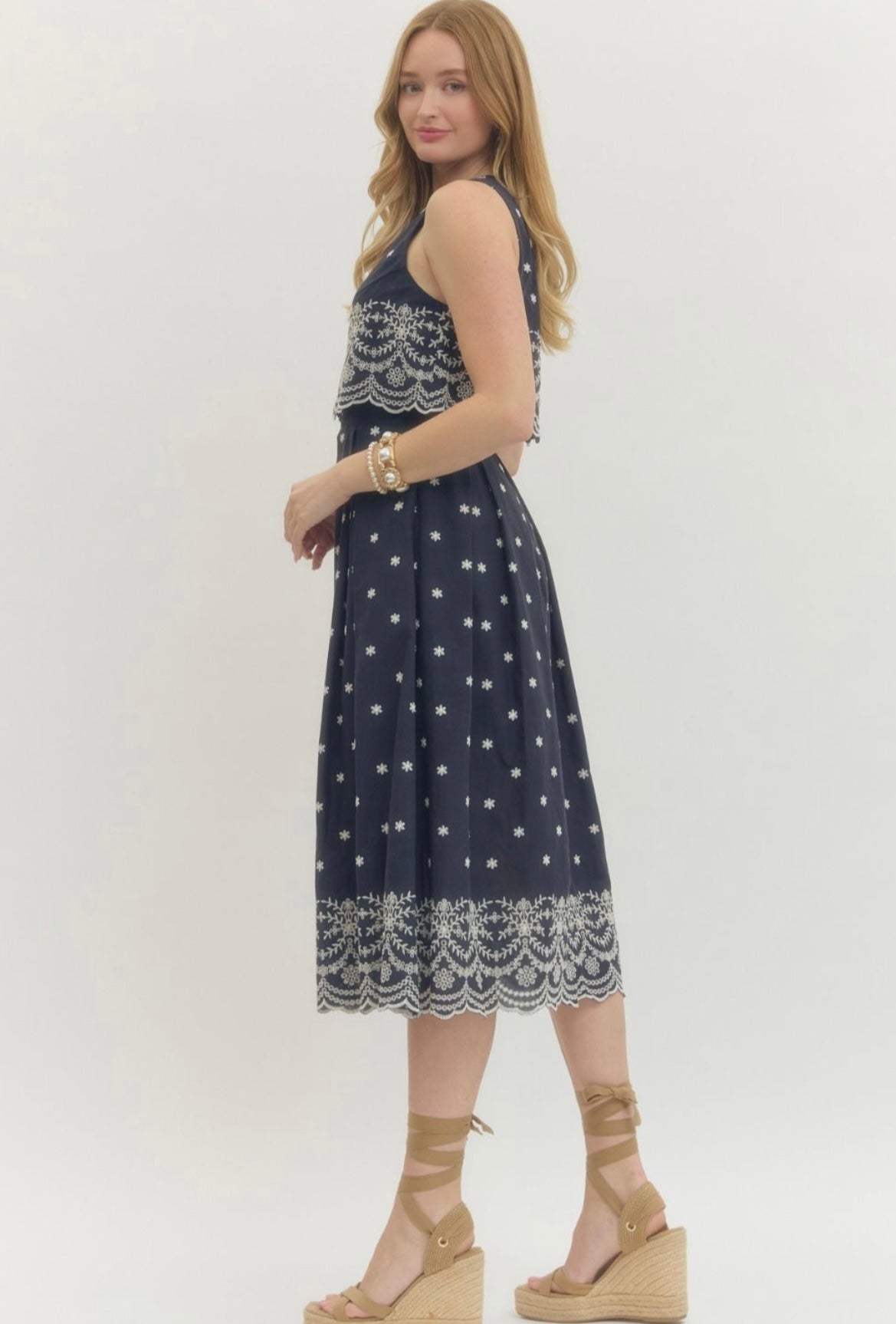 Embroidered sleeveless midi dress featuring scallop lace overlay at bodice and hem. Keyhole opening with button and hidden zipper closure at back.. Side pockets. Lined. Woven.