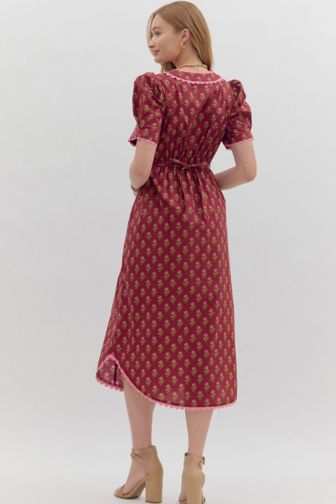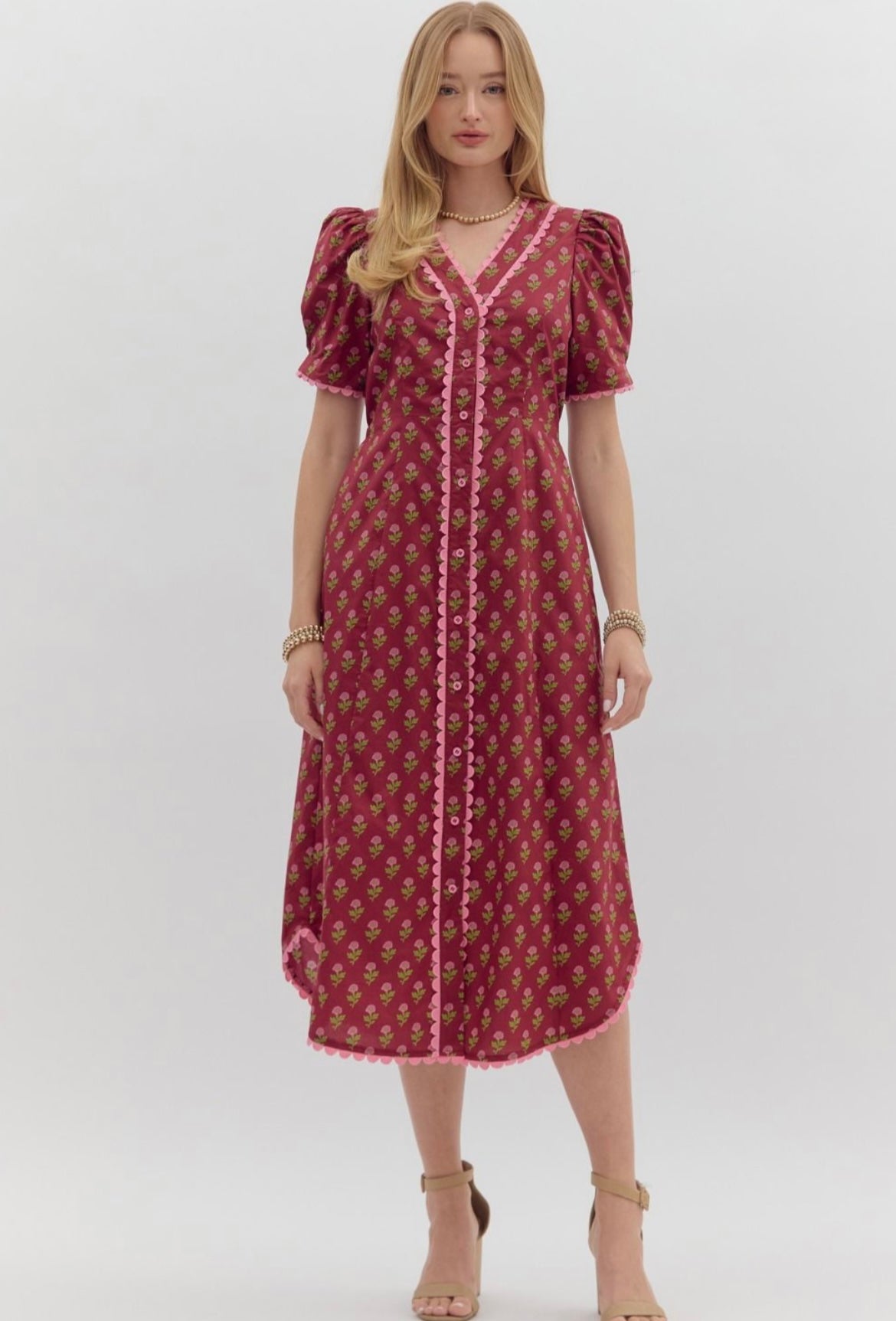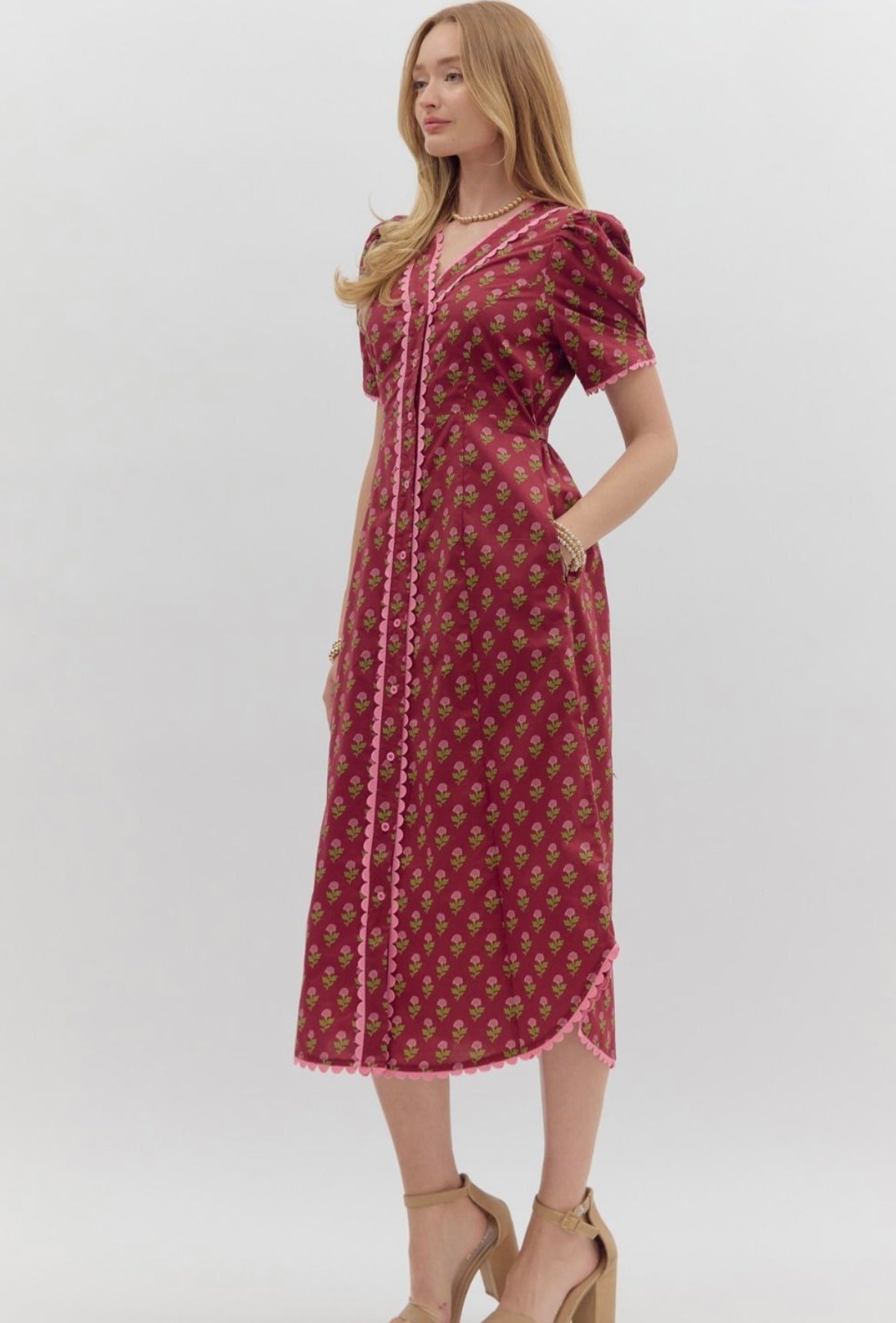 Floral print shoulder puff short sleeve midi dress featuring pink accent scallop trim V-neck button closure. Pockets at sides. Lined. Woven. Non-sheer. Lightweight.